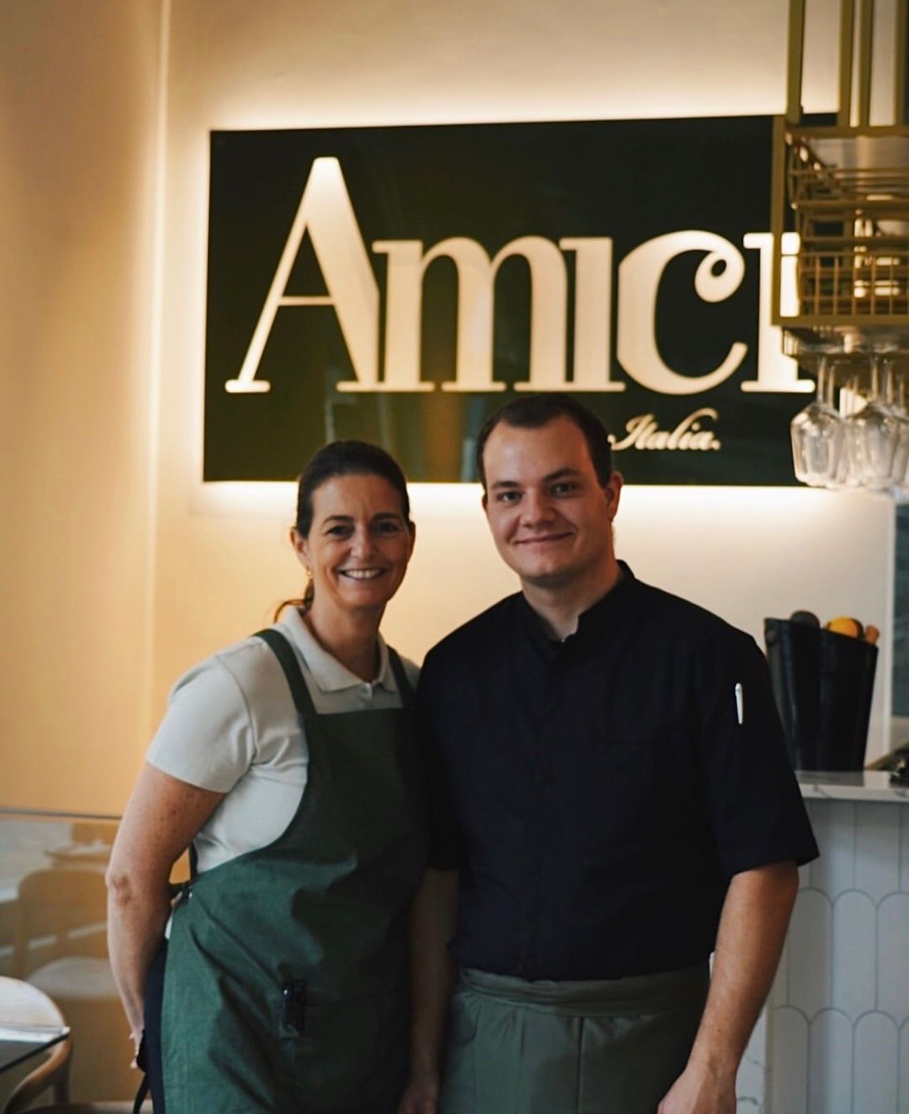 Bij Amici in Groningen draait volgens Sabine en Lars alles om Italië. Niet alleen op het bord, maar in de hele manier van denken. Sabine komt zelf uit een echte Italiaanse familie, met ouders uit Italië en een lange geschiedenis in de horeca. Sabine runt al jaren restaurant Italia, en vanuit die basis groeide de wens om nog een échte Italiaanse zaak op te zetten. Toen het pand van Amici op hun pad kwam, viel alles op zijn plek. “Het concept zat eigenlijk al in ons hoofd,” zeggen ze. “We hadden allebei hetzelfde beeld van hoe het moest voelen: modern, warm, Italiaans tot in de details.”