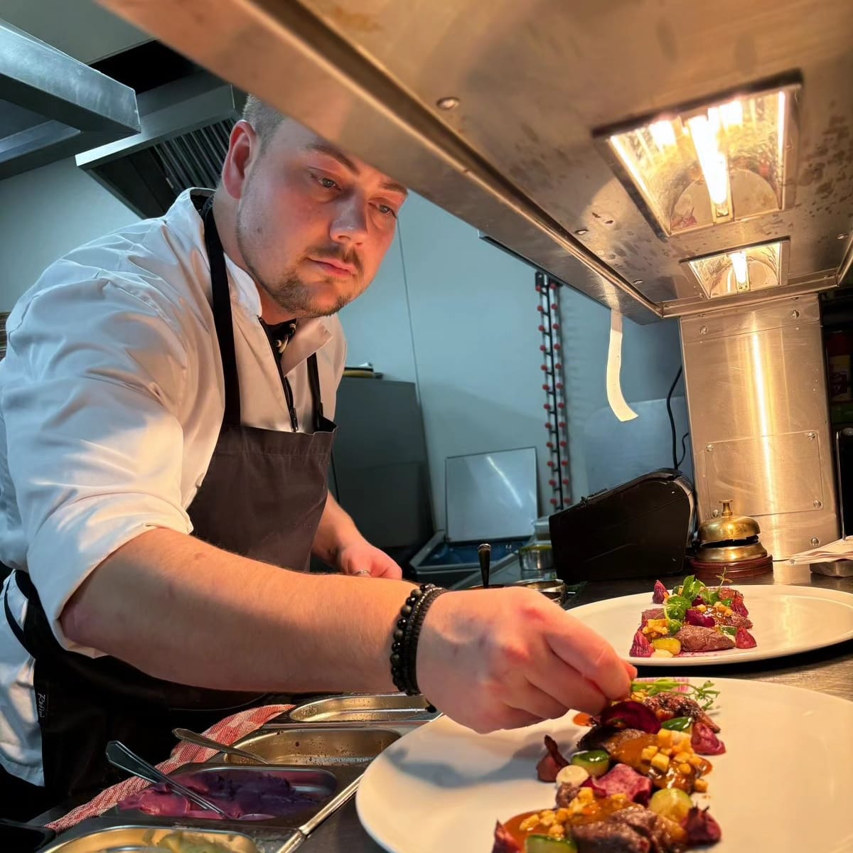 Per 1 september nam Stephano Philips op zijn 34ste het Wapen van Ruinen over. Geen sprong in het diepe, maar een logische volgende stap. Hij werkte er al vijf en een half jaar in de keuken en kent het bedrijf van binnen en buiten. Na zijn koksopleiding niveau 2 en zelfstandig werkend kok niveau 3 rolde hij de keuken in, startte in 2016 zijn eerste eigen zaak en maakte daar mooie stappen, met zelfs een vermelding in de Gault Millau. Na een periode in loondienst kwam de vraag of hij het Wapen van Ruinen wilde overnemen. “Ik heb lang gewikt en gewogen,” zegt hij. “Maar dit is een gouden locatie. Hier kan ik echt iets neerzetten wat nog niet in Ruinen bestaat.”