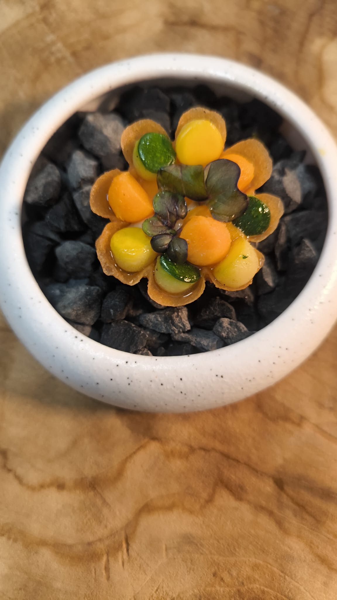 Overdag een toegankelijke, fatsoenlijke lunch, ’s avonds een uitgewerkt diner op fine dining niveau: dat is de lijn. Wat de hele dag doorloopt, is ambacht. Brood, bonbons, fonds, wild, gerookte vis, spek voor de uitsmijter: alles wordt zoveel mogelijk zelf gemaakt. Wild komt via een vaste jager, groente, kruiden en eetbare bloemen komen van lokale telers rond Ruinen. Die liefde voor dichtbij begon al toen Stephano als leerlingkok werkte bij een bedrijf dat sterk op regionale producten dreef, met een eigen kruiden en bloementuin. “Sinds de overname kan ik die keuze volledig zelf maken,” vertelt hij. “Je ziet dat het lokale en ambachtelijke daardoor nog duidelijker naar voren komt.”